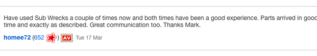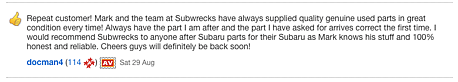 Sub Wrecks has achieved the highest rating available for PRICE, PARTS QUALITY, and DELIVERY on PartsTrader. The industry-leading marketplace for Panelbeaters and Insurance companies to purchase Car Parts